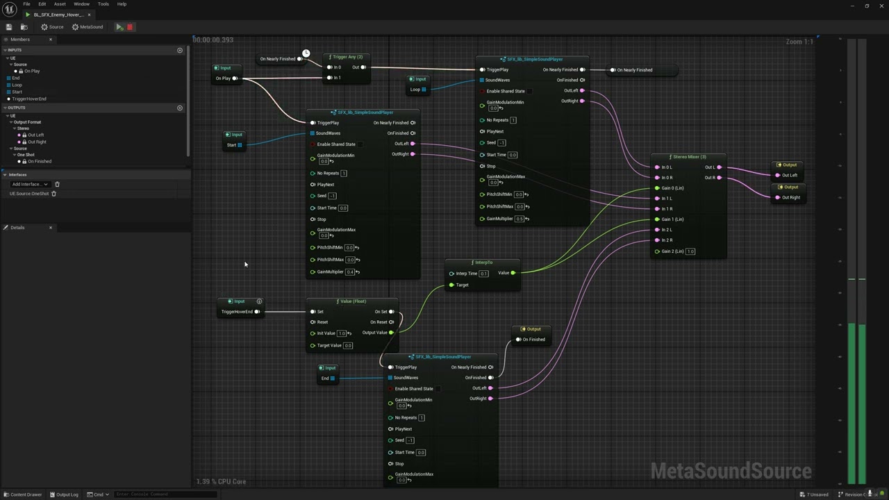 Looping sounds with tails — Sustained sounds (like a hovering enemy) need to loop cleanly during gameplay and then play a natural fade-out tail when the source stops. The MetaSound template handles the transition from loop to tail seamlessly: