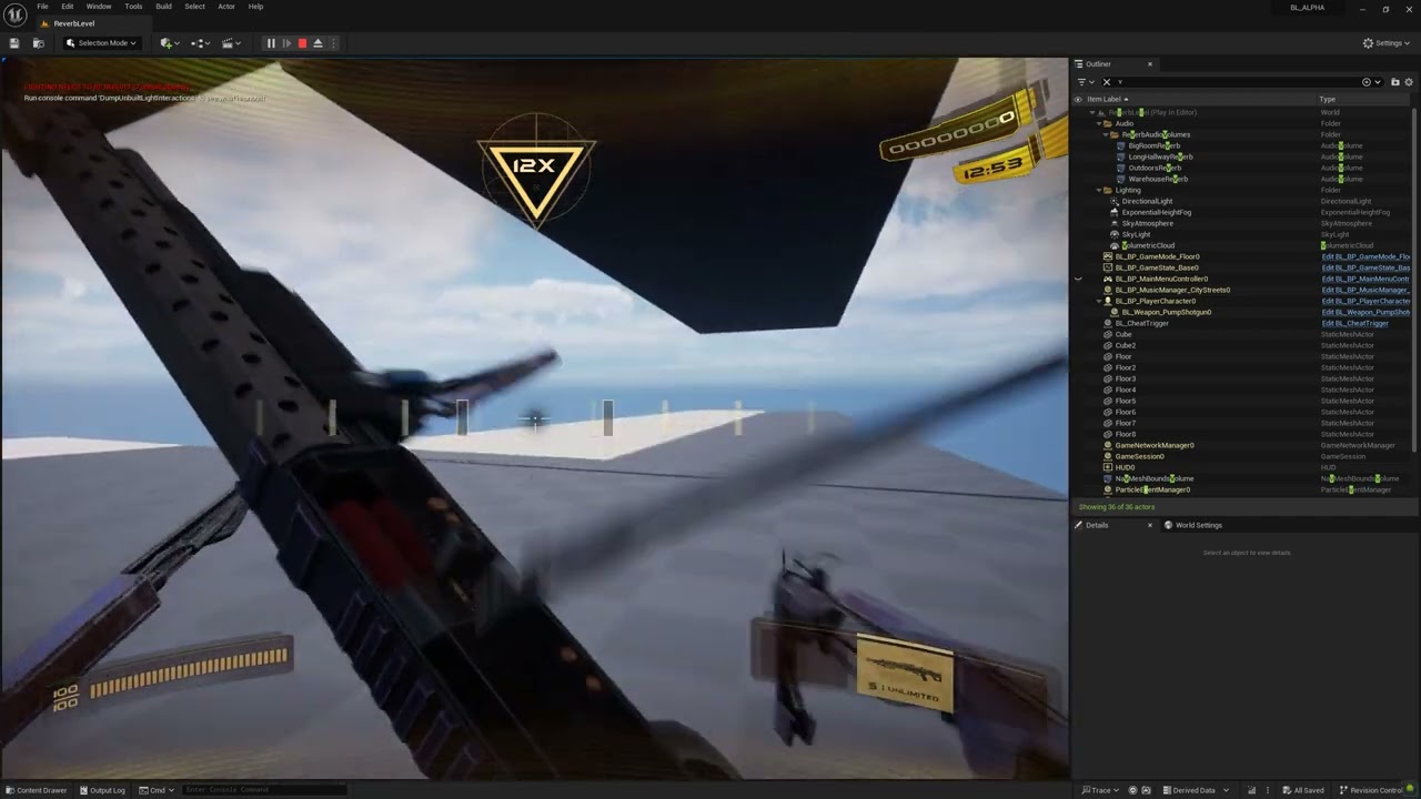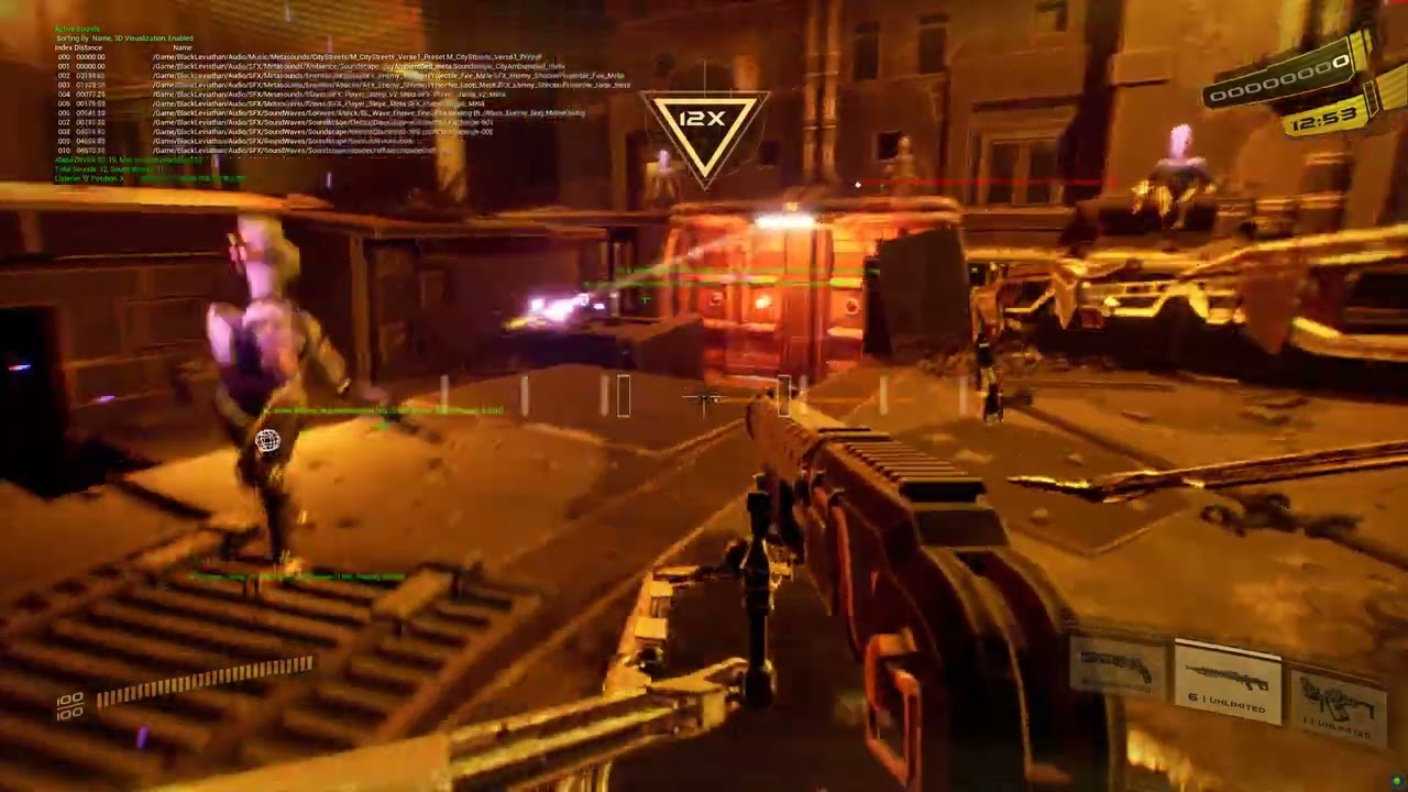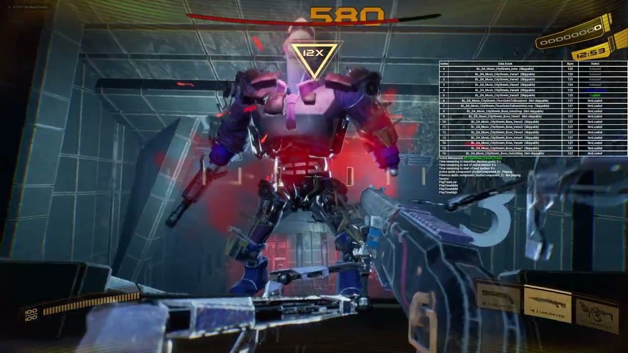 Accuracy-reactive sound playback — Weapons produce different SFX depending on how close the player’s shot is to the beat. A perfect-beat hit, a near-miss, and an off-beat shot each trigger distinct sound variations, giving immediate audio feedback on timing accuracy: