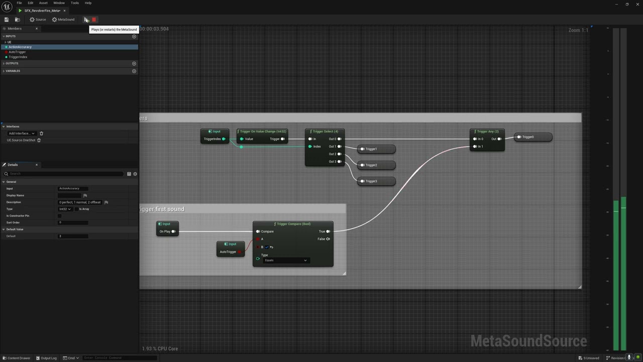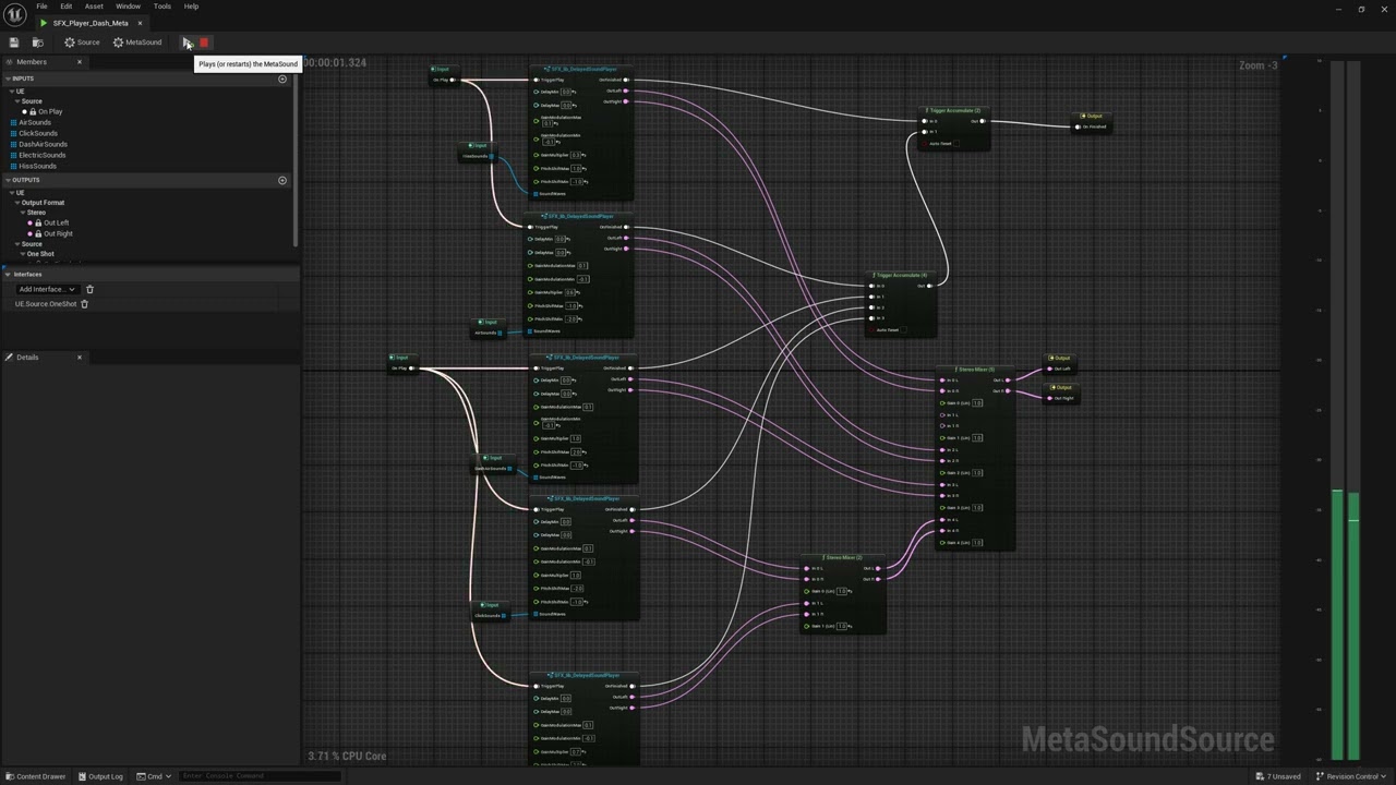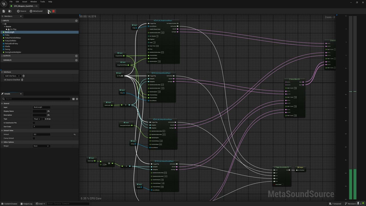The SFX implementation relies on custom MetaSound templates I built for three core behaviors: