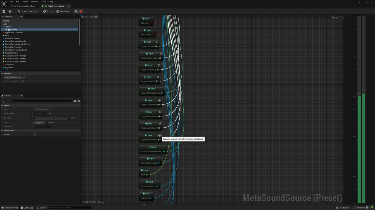- ▸ Designed the MetaSounds Procedural Music System supporting intensity layers, section transitions, and licensed track integration.